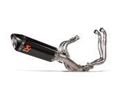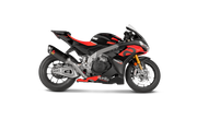 The combination of race-proven, lightweight materials, exceptional production quality, perfect design, amazing sound, and top performance makes this exhaust a must-have for discerning riders that demand the best. It is constructed with a carbon-fibre muffler outer sleeve and end cap, with a fully titanium link pipe and inner muffler structure, matched to high-grade titanium alloy for the headers and collectors, resulting in a full system that is 44% lighter than stock. Developed for use on closed-course competition circuits, this racing track–oriented system requires mandatory remapping and removal of the passenger footrest. It delivers increases of power and torque of 4.0 kW (5.4 hp) at 13,000 rpm and 3.8 Nm at 7,700 rpm when measured in back-to-back comparisons against an Aprilia RSV4 with a standard stock system on the in-house dyno. This race-developed system delivers a distinctive deep, sporty sound, perfectly endorsing the Akrapovič character.