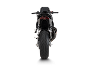 Race-proven materials and sporty design have led to an exhaust that is the perfect introduction to the exhaust tuning process. The carbon-fibre muffler outer sleeve and end cap are stylishly shaped for a visual impact, and the use of lightweight titanium for the link pipe and inner structure means this system weighs in at 3.5 kg lighter than stock, for an impressive savings of 62.4%. This exhaust has been developed for use on closed-course competition circuits, and it delivers track performance to match that demand. Power is increased by 3.6 kW (4.9 hp) at 13,000 rpm and torque up by 4.5 Nm at 7,600 rpm when compared in back-to-back tests on the Akrapovič dyno with an Aprilia RSV4 with a standard stock exhaust. To match the performance and style, the Slip-On Line (Carbon) system serves up a deep and vivid sound, full of Akrapovič character, to totally encapsulate the Aprilia engine.